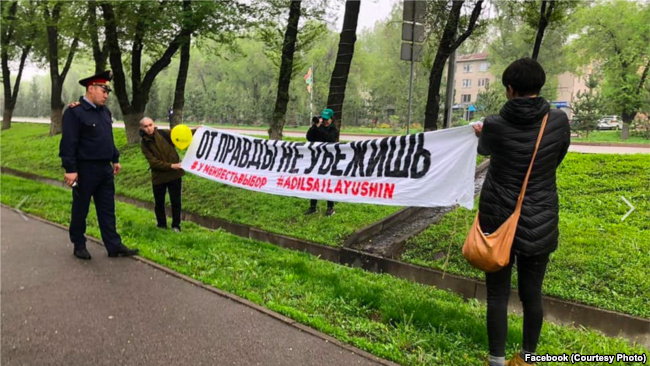 On the 21st of April, the big marathon was held in Almaty. Some activists put a big banner on the road – which stated “You cannot run from truth.” Innosent writing – but the police took them to jail.